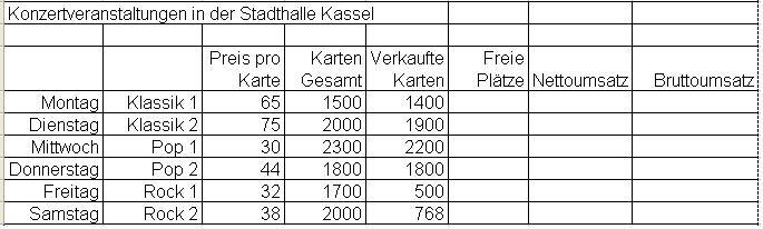 Du bekommst von der Geschäftsleitung den Arbeitsauftrag, die Abrechnung der Konzertveranstaltungen in der Stadthalle Kassel für das laufende Halbjahr zu erstellen.