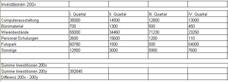 Du bekommst von der Geschäftsleitung der Ritzel Flitzer GmbH den Arbeitsauftrag, eine Auflistung der Investitionen Ritzel Flitzer GmbH 200x* zu erstellen.