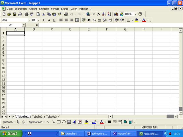 Arbeitsoberfläche EXCEL 2003 & TabellengestaltungLerninhalte 1. EXCEL-Startbildschirm & wesentlichste Programmfunktionen2. Was bedeutet Tabellenkalkulation mit EXCEL?3. Aufbau der EXCEL-Tabelle4. Erstellung einfacher Formeln5. Vorteil einer Tabellenkalkulation6. Leistungsumfang von EXCEL7. Bestandteile einer Tabelle (DIN 55301)8. Übungsaufgabe zur Formelbildung