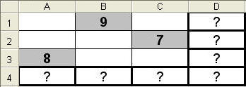 2. Schritt: Formeln in die (Ergebnis)Zellen eingeben Da wo sich die Fragezeichen befinden (s. o.), sollst du nun jeweils eine Summen-Formel eingeben (insgesamt 7 Formeln). Und so sollen die Summen-Formeln eingegeben werden: ► 3 x waagerecht: in den (Ergebnis)Zellen D1 bis D3 ► 3 x senkrecht: in den (Ergebnis)Zellen A4, B4 und C4 ► 1 x diagonal: in der (Ergebnis)Zelle D4