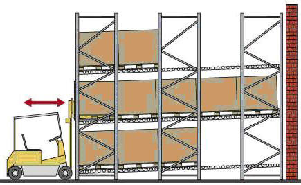 Meist lagern 3 Paletten hintereinander im Kanal; möglich sind aber auch durchaus bis zu 8 Paletten und mehr hintereinander. Die zuletzt eingesetzte Palette wird als erste wieder herausgenommen, d. h. das Einschubregal arbeitet daher nach dem Einlagerungsprinzip „Last in - First out“ („zuletzt rein – zuerst raus“). Da meist ein Gabelstapler die Ein- und Auslagerung regelt, sind üblicherweise nur zwei Endanschläge als Sicherheitselemente erforderlich (je nach Ware werden aber auch hier manchmal aus Sicherheitsgründen spezielle Doppelbremstragrollen eingesetzt). 2. Bedienung Zur Ein- und Auslagerung der Paletten wird in der Regel ein normaler Gabelstapler verwendet. Demnach liegt hier bei der Kommissionierung die statische Bereitstellung „Mensch zur Ware“ vor.
